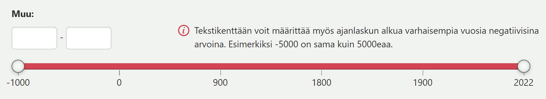 - Aikajana -säätimen avulla tulokset voidaan rajata tiettyyn ajanjaksoon. Huomaathan, ettei kaikkiin aineistoihin sisälly tietoa ajoituksesta.