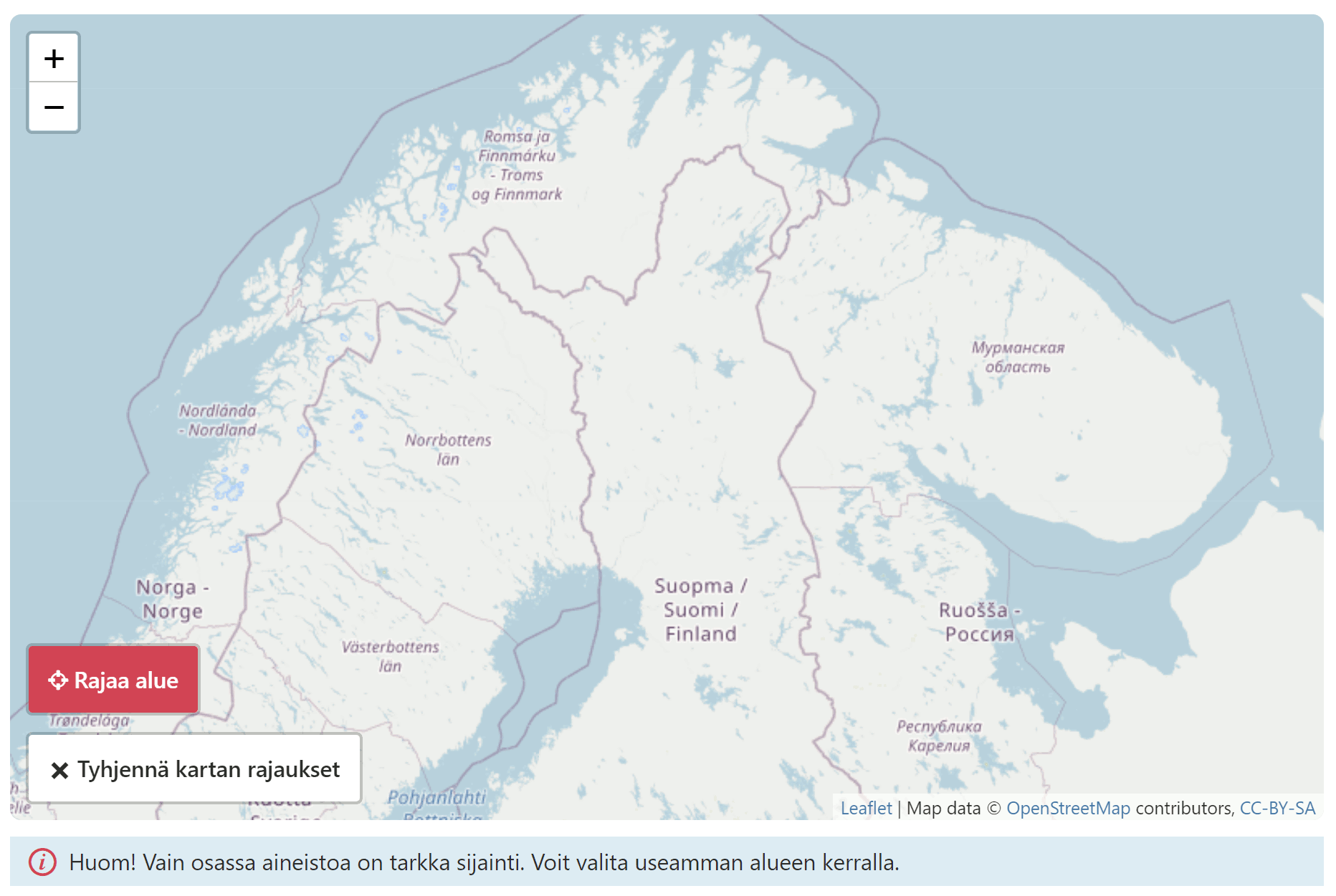 - Kartan avulla tuloksia voidaan rajata valitun maantieteellisen alueen mukaisesti. Huomaathan, ettei kaikkiin aineistoihin sisälly paikkatietoa. Lisäksi paikkatieto on lisätty useisiin aineistoihin automaattisesti, ja se voi olla myös virheellinen.