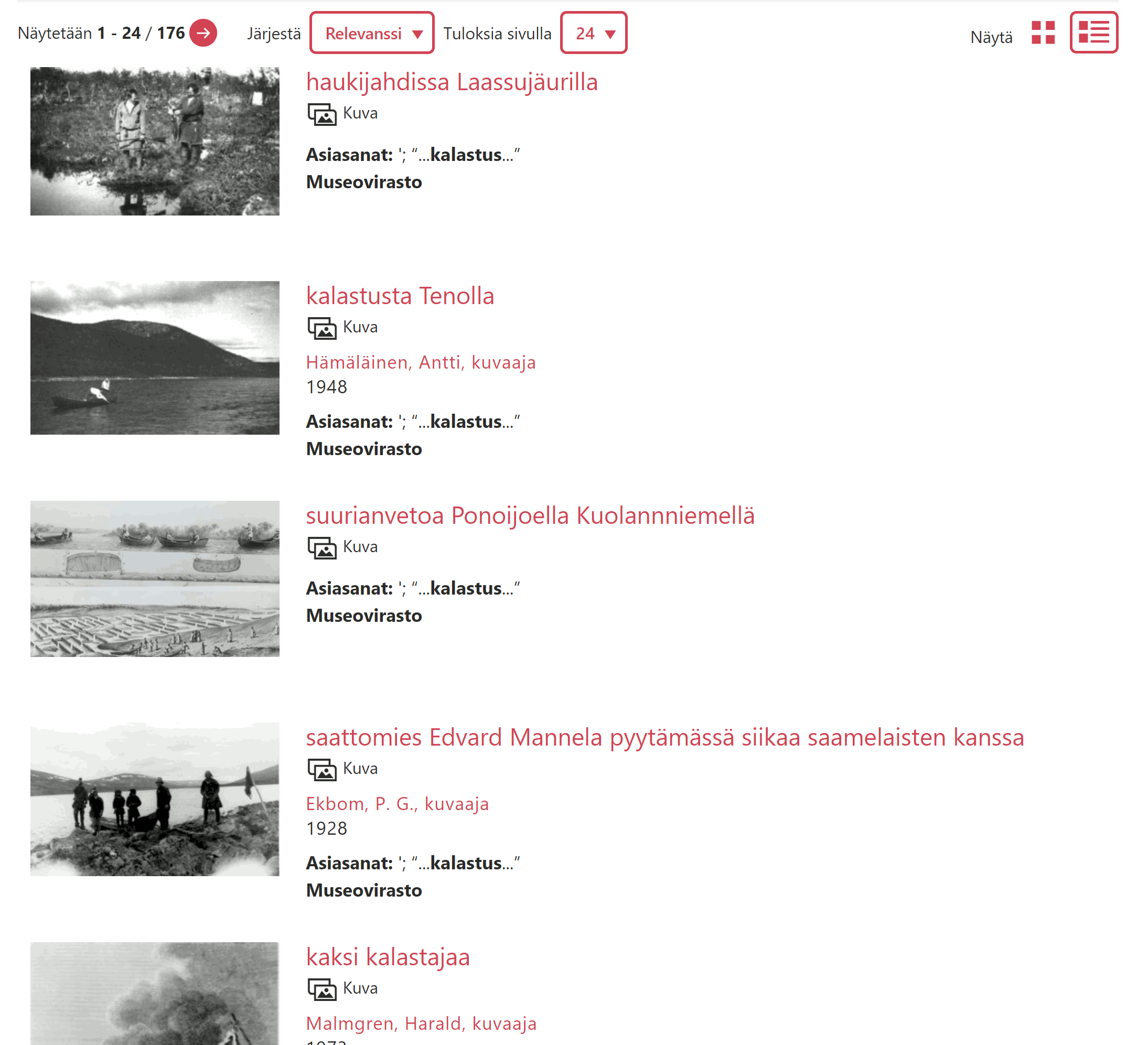 Jokaisesta tuloksesta näytetään esikatselukuva, jos se on saatavilla, sekä nimike ja tietoja, kuten tarjoava organisaatio, aineistotyyppi sekä ajoitus tai aikaväli. Tietueen nimikettä napsauttamalla voi siirtyä sen omalle sivulle, joka sisältää tarkempia tietoja kyseisestä aineistosta. Esikatselukuvaa napsauttamalla kuva avautuu kuvien selailuun tarkoitetussa näkymässä.